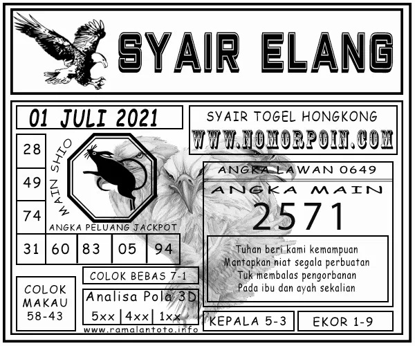 Tetaplah pergunakan perasaan anda sendiri untuk memahami semua makna dari Syair HK 01 Juli 2021. Jangan terlalu terburu – buru ya saat membaca semua makna dari syair hk kami ini. Pahami dan cerna secara pelan dan pilih lah salah satu syair yang paling terfavorit oleh para penikmat pecinta judi togel online. Oh ya tahukan kalian pada dasarnya ada beberapa syair yang paling banyak dicari oleh jutaan para pemain judi togel online seperti syair kampleng, syair pandawa hk, syair mbah semar, syair hk naga mas.