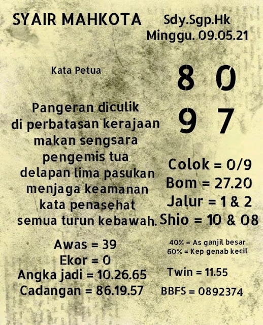 Tetaplah pergunakan perasaan anda sendiri untuk memahami semua makna dari Syair HK 09 Mei 2021. Jangan terlalu terburu – buru ya saat membaca semua makna dari syair hk kami ini. Pahami dan cerna secara pelan dan pilih lah salah satu syair yang paling terfavorit oleh para penikmat pecinta judi togel online. Oh ya tahukan kalian pada dasarnya ada beberapa syair yang paling banyak dicari oleh jutaan para pemain judi togel online seperti syair kampleng, syair pandawa hk, syair mbah semar, syair hk naga mas.