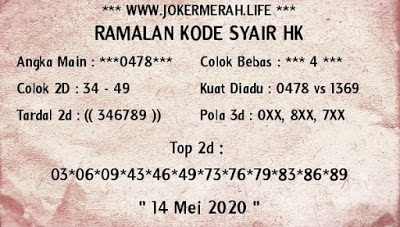 Permainan togel online ini sangatlah membutuhkan kesadaran diri di dalam membaca dan memprediksi suatu angka. Maka dari itu kunjungi selalu kode syair hk hari ini dimana dalam forum syair hk hari ini yang kami terbitkan ini akan jauh lebih memudahkan anda dalam menebak angka keluaran di periode selanjutnya. Kami juga sudah mempersiapkan Prediksi Syair HK Akurat 14 Mei 2020 untuk anda member tercinta kami.