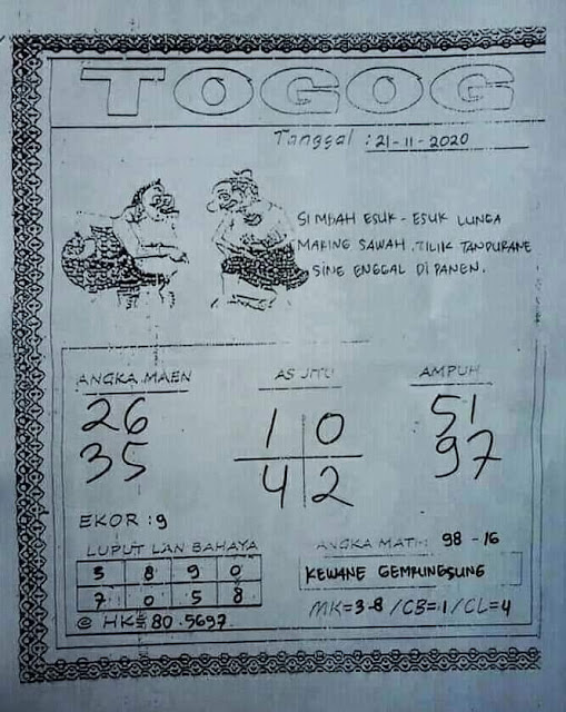 Permainan togel online ini sangatlah membutuhkan kesadaran diri di dalam membaca dan memprediksi suatu angka. Maka dari itu kunjungi selalu kode syair hk hari ini dimana dalam forum syairhk hari ini yang kami terbitkan ini akan jauh lebih memudahkan anda dalam menebak angka keluaran di periode selanjutnya. Kami juga sudah mempersiapkan Prediksi HK Akurat 21 November 2020 untuk anda member tercinta kami.