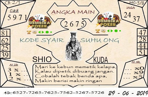 Permainan togel online ini sangatlah membutuhkan kesadaran diri di dalam membaca dan memprediksi suatu angka. Maka dari itu kunjungi selalu kode syair hk hari ini dimana dalam forum syair hk hari ini yang kami terbitkan ini akan jauh lebih memudahkan anda dalam menebak angka keluaran di periode selanjutnya. Kami juga sudah mempersiapkan Prediksi HK Akurat 29 Juni 2020 untuk anda member tercinta kami.
