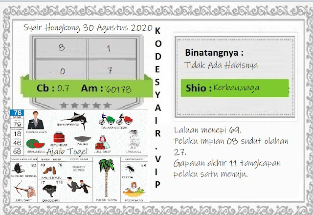 Tetaplah pergunakan perasaan anda sendiri untuk memahami semua makna dari Syair HK 30 Agustus 2020. Jangan terlalu terburu – buru ya saat membaca semua makna dari syair hk kami ini. Pahami dan cerna secara pelan dan pilih lah salah satu syair yang paling terfavorit oleh para penikmat pecinta judi togel online. Oh ya tahukan kalian pada dasarnya ada beberapa syair yang paling banyak dicari oleh jutaan para pemain judi togel online seperti syair kampleng, syair pandawa hk, syair mbah semar, syair hk naga mas.