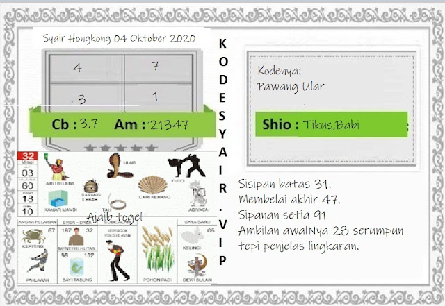 Permainan togel online ini sangatlah membutuhkan kesadaran diri di dalam membaca dan memprediksi suatu angka. Maka dari itu kunjungi selalu kode syair hk hari ini dimana dalam forum syairhk hari ini yang kami terbitkan ini akan jauh lebih memudahkan anda dalam menebak angka keluaran di periode selanjutnya. Kami juga sudah mempersiapkan Prediksi HK Akurat 4 November 2020 untuk anda member tercinta kami.