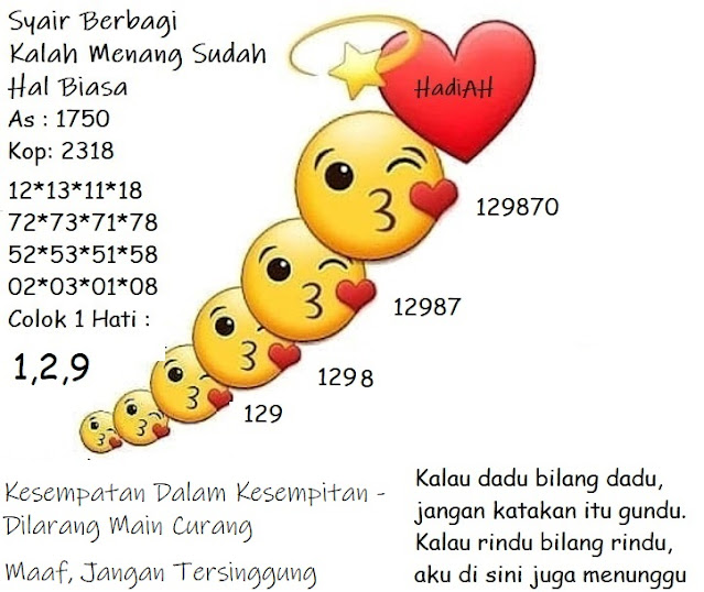 Tetaplah pergunakan perasaan anda sendiri untuk memahami semua makna dari Syair HK 9 Desember 2020. Jangan terlalu terburu – buru ya saat membaca semua makna dari syair hk kami ini. Pahami dan cerna secara pelan dan pilih lah salah satu syair yang paling terfavorit oleh para penikmat pecinta judi togel online. Oh ya tahukan kalian pada dasarnya ada beberapa syair yang paling banyak dicari oleh jutaan para pemain judi togel online seperti syair kampleng, syair pandawa hk, syair mbah semar, syair hk naga mas.