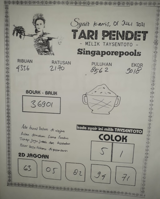 Tetap pergunakan naluri diri sendiri untuk membaca serta mengerti makna asal Syair Sgp 01 Juli 2021. Para Pemain Judi Online sebaiknya jangan terlalu terburu – buru dalam membaca makna yang berasal dari prediksi syair singapore kami. Pahamilah secara pelan serta pilih salah satu diantara syair yang paling banyak dicari oleh para pecinta togel online. Meskipun syair togel yang kami berikan ini sangat banyak serta beraneka ragam, tetapi pada dasarnya ada beberapa syair yang sangat banyak dicari seperti syair kampleng, syair pandawa, syair mbah semar, serta syair naga mas.