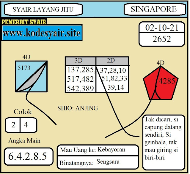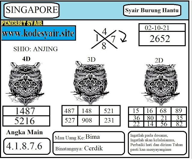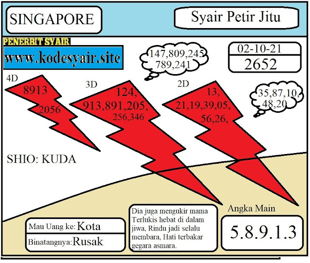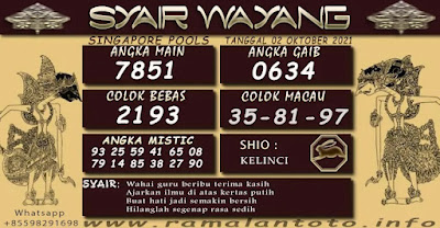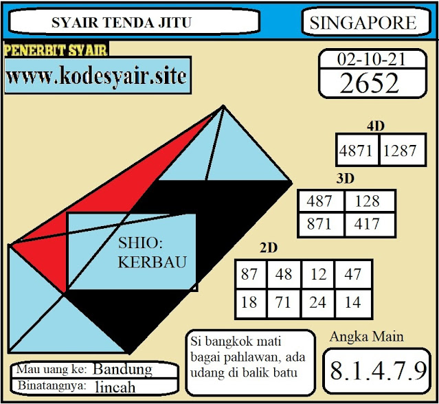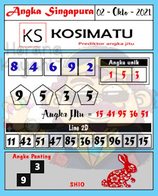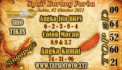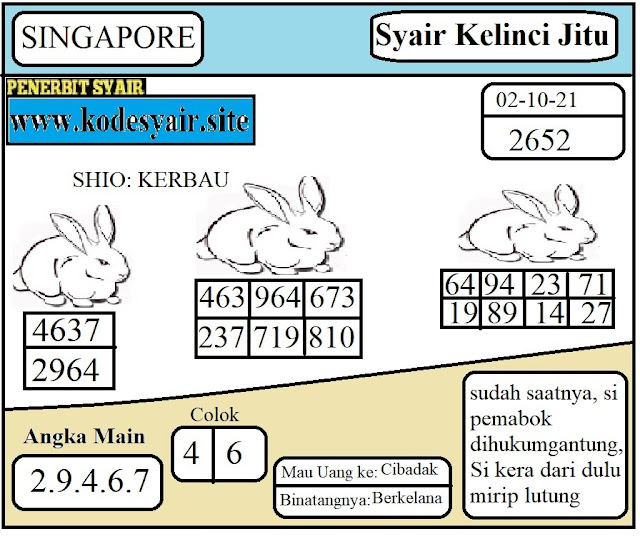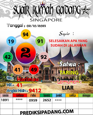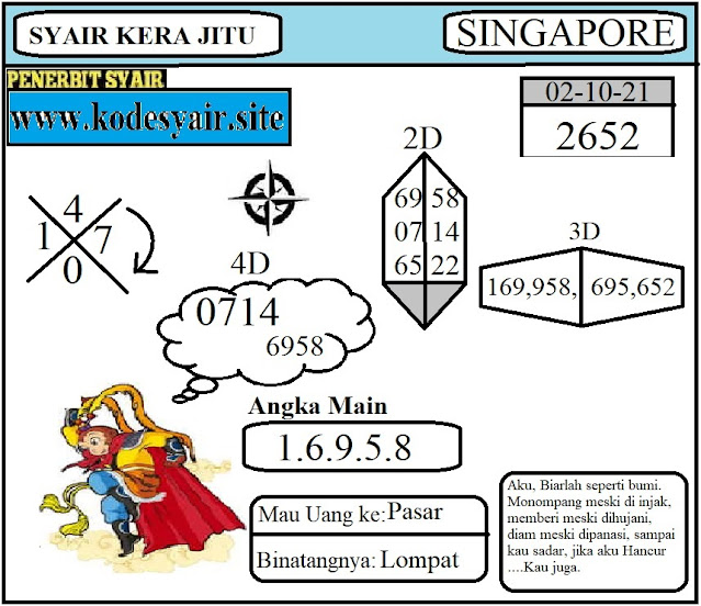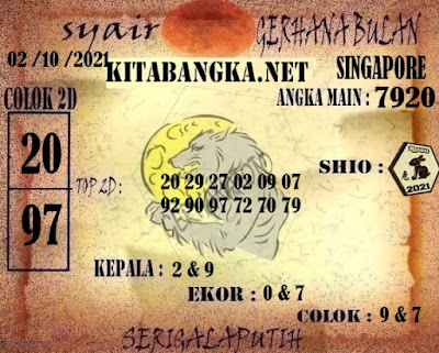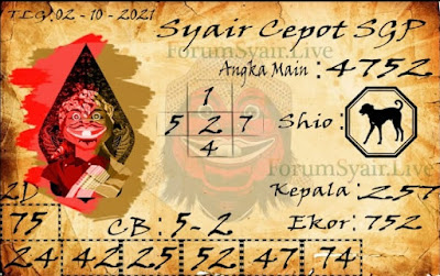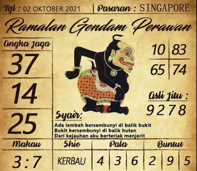Pada dasarnya dalam semua permainan togel online ini sangatlah membutuhkan kepekaan atau kesadaran anda dalam membaca serta memprediksi nomor togel singapore. Oleh karena itu syair Togel Singapore yang kami terbitkan ini akan sangat memudahkan para pejudi online saat memprediksi angka keluaran di periode selanjutnya. kami sudah mempersiapkan dengan jelas tentang Prediksi togel Sgp 02 Oktober 2021 untuk anda para pencinta judi online.