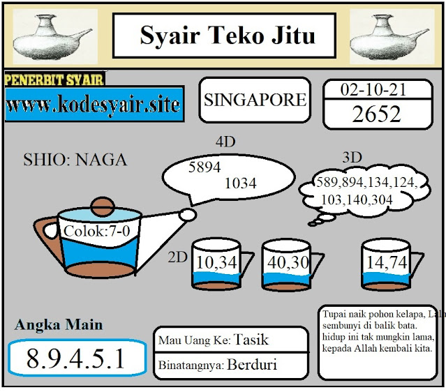 Tetap pergunakan naluri diri sendiri untuk membaca serta mengerti makna asal Syair Sgp 02 Oktober 2021. Para Pemain Judi Online sebaiknya jangan terlalu terburu – buru dalam membaca makna yang berasal dari prediksi syair singapore kami. Pahamilah secara pelan serta pilih salah satu diantara syair yang paling banyak dicari oleh para pecinta togel online. Meskipun syair togel yang kami berikan ini sangat banyak serta beraneka ragam, tetapi pada dasarnya ada beberapa syair yang sangat banyak dicari seperti syair kampleng, syair pandawa, syair mbah semar, serta syair naga mas.