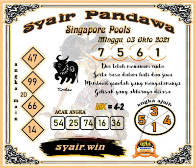 Tetap pergunakan naluri diri sendiri untuk membaca serta mengerti makna asal Syair Sgp 03 Oktober 2021. Para Pemain Judi Online sebaiknya jangan terlalu terburu – buru dalam membaca makna yang berasal dari prediksi syair singapore kami. Pahamilah secara pelan serta pilih salah satu diantara syair yang paling banyak dicari oleh para pecinta togel online. Meskipun syair togel yang kami berikan ini sangat banyak serta beraneka ragam, tetapi pada dasarnya ada beberapa syair yang sangat banyak dicari seperti syair kampleng, syair pandawa, syair mbah semar, serta syair naga mas.