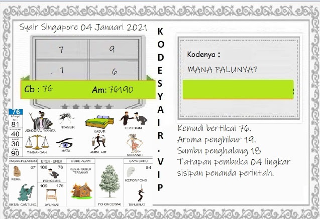 Tetap pergunakan naluri diri sendiri untuk membaca serta mengerti makna asal Syair Sgp 04 Februari 2021. Para Pemain Judi Online sebaiknya jangan terlalu terburu – buru dalam membaca makna yang berasal dari prediksi syair singapore kami. Pahamilah secara pelan serta pilih salah satu diantara syair yang paling banyak dicari oleh para pecinta togel online. Meskipun syair togel yang kami berikan ini sangat banyak serta beraneka ragam, tetapi pada dasarnya ada beberapa syair yang sangat banyak dicari seperti syair kampleng, syair pandawa, syair mbah semar, serta syair naga mas.