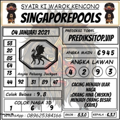 Pada dasarnya dalam semua permainan togel online ini sangatlah membutuhkan kepekaan atau kesadaran anda dalam membaca serta memprediksi nomor togel singapore. Oleh karena  itu syair Togel Singapore yang kami terbitkan ini akan sangat memudahkan para pejudi online saat memprediksi angka keluaran di periode selanjutnya. kami  sudah mempersiapkan dengan jelas tentang Prediksi Togel Sgp 04 Januari 2021 untuk anda para pencinta judi online.