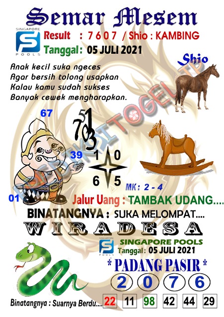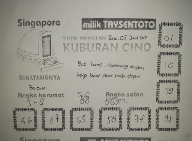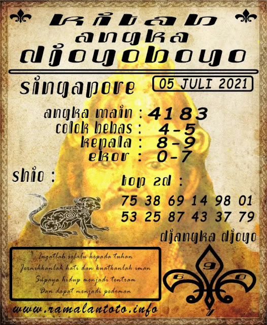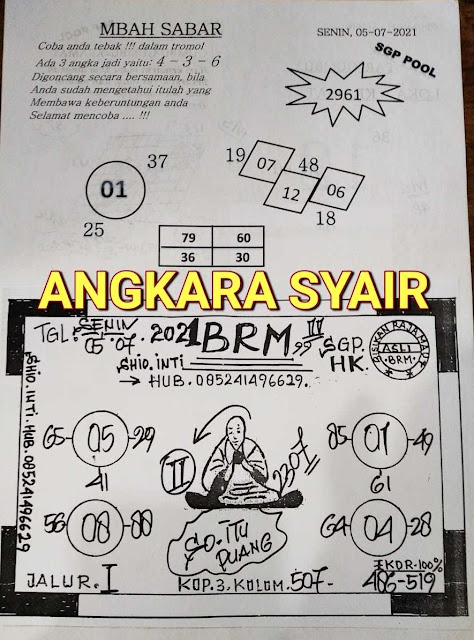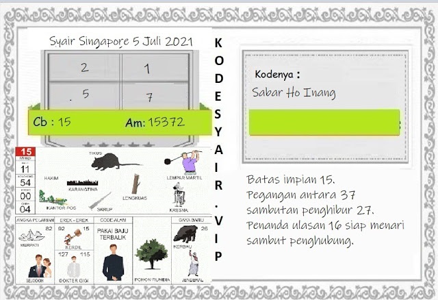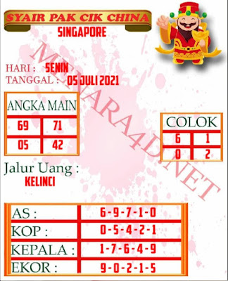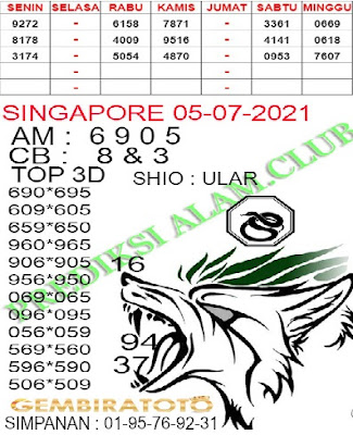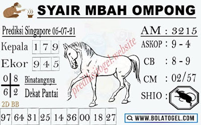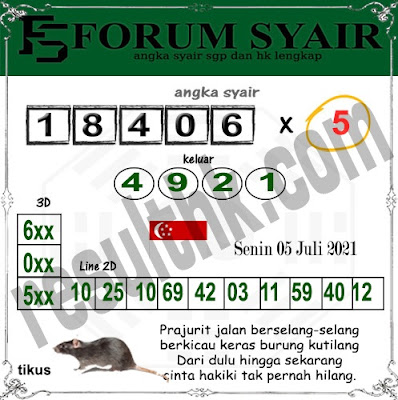 Pada dasarnya dalam semua permainan togel online ini sangatlah membutuhkan kepekaan atau kesadaran anda dalam membaca serta memprediksi nomor togel singapore. Oleh karena itu syair Togel Singapore yang kami terbitkan ini akan sangat memudahkan para pejudi online saat memprediksi angka keluaran di periode selanjutnya. kami sudah mempersiapkan dengan jelas tentang Prediksi togel Sgp 05 Juli 2021 untuk anda para pencinta judi online.