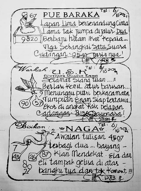 Tetap pergunakan naluri diri sendiri untuk membaca serta mengerti makna asal Syair Sgp 06 Oktober 2021. Para Pemain Judi Online sebaiknya jangan terlalu terburu – buru dalam membaca makna yang berasal dari prediksi syair singapore kami. Pahamilah secara pelan serta pilih salah satu diantara syair yang paling banyak dicari oleh para pecinta togel online. Meskipun syair togel yang kami berikan ini sangat banyak serta beraneka ragam, tetapi pada dasarnya ada beberapa syair yang sangat banyak dicari seperti syair kampleng, syair pandawa, syair mbah semar, serta syair naga mas.