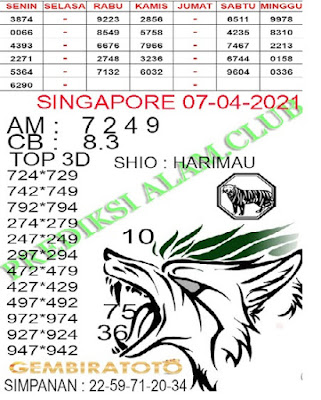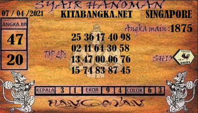 Pada dasarnya dalam semua permainan togel online ini sangatlah membutuhkan kepekaan atau kesadaran anda dalam membaca serta memprediksi nomor togel singapore. Oleh karena itu syair Togel Singapore yang kami terbitkan ini akan sangat memudahkan para pejudi online saat memprediksi angka keluaran di periode selanjutnya. kami sudah mempersiapkan dengan jelas tentang Prediksi togel Sgp 07 April 2021 untuk anda para pencinta judi online.