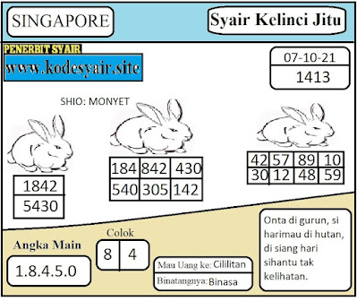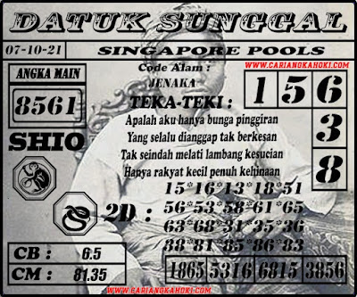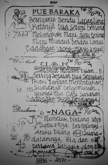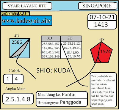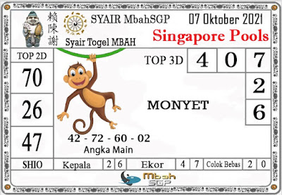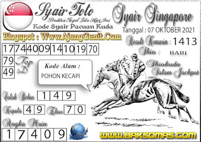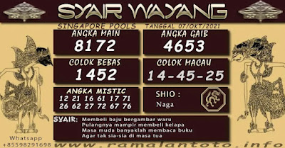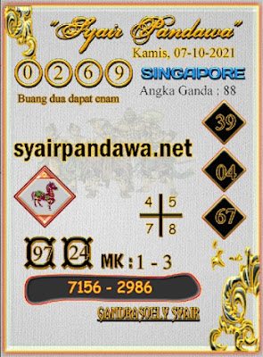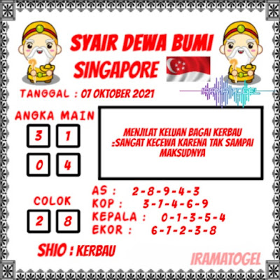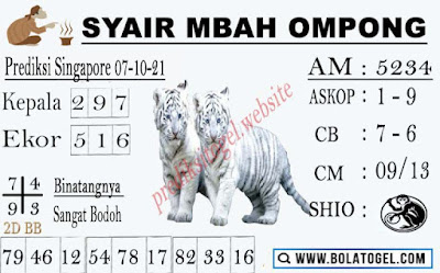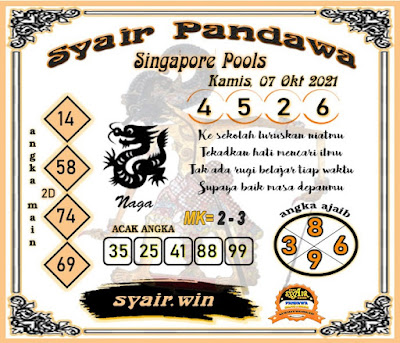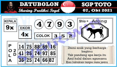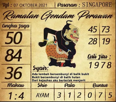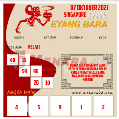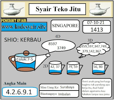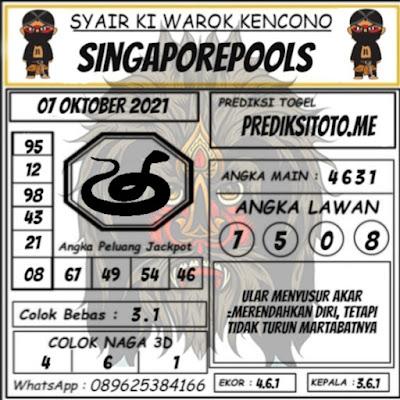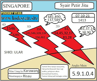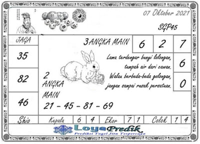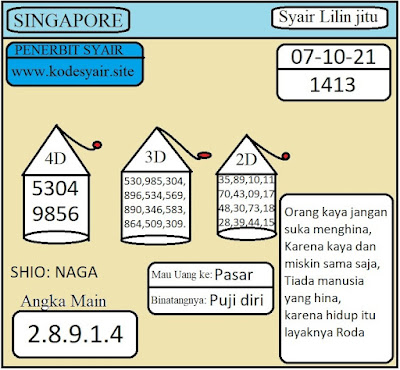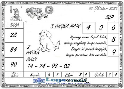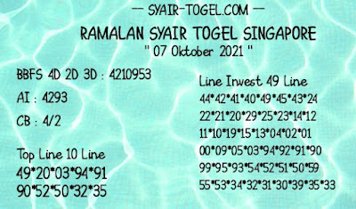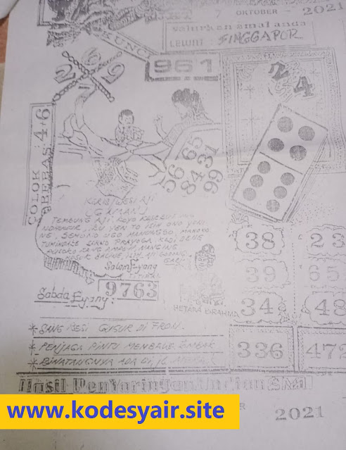 Pada dasarnya dalam semua permainan togel online ini sangatlah membutuhkan kepekaan atau kesadaran anda dalam membaca serta memprediksi nomor togel singapore. Oleh karena itu syair Togel Singapore yang kami terbitkan ini akan sangat memudahkan para pejudi online saat memprediksi angka keluaran di periode selanjutnya. kami sudah mempersiapkan dengan jelas tentang Prediksi togel Sgp 07 Oktober 2021 untuk anda para pencinta judi online.