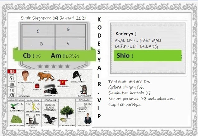 Tetap pergunakan naluri diri sendiri untuk membaca serta mengerti makna asal Syair Sgp 09 Januari 2021. Para Pemain Judi Online sebaiknya jangan terlalu terburu – buru dalam membaca makna yang berasal dari prediksi syair sgp kami. Pahamilah secara pelan serta pilih salah satu diantara syair yang paling banyak dicari oleh para pecinta togel online. Meskipun syair togel yang kami berikan ini sangat banyak serta beraneka ragam, tetapi pada dasarnya ada beberapa syair yang sangat banyak dicari seperti syair kampleng, syair pandawa, syair mbah semar, serta syair naga mas.