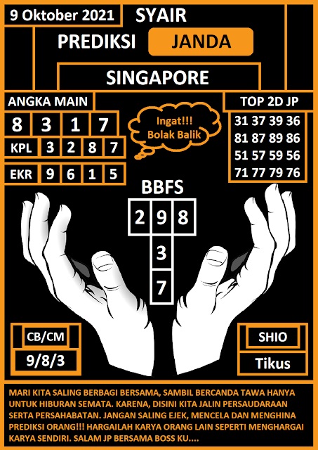 Pada dasarnya dalam semua permainan togel online ini sangatlah membutuhkan kepekaan atau kesadaran anda dalam membaca serta memprediksi nomor togel singapore. Oleh karena itu syair Togel Singapore yang kami terbitkan ini akan sangat memudahkan para pejudi online saat memprediksi angka keluaran di periode selanjutnya. kami sudah mempersiapkan dengan jelas tentang Prediksi togel Sgp 09 Oktober 2021 untuk anda para pencinta judi online.