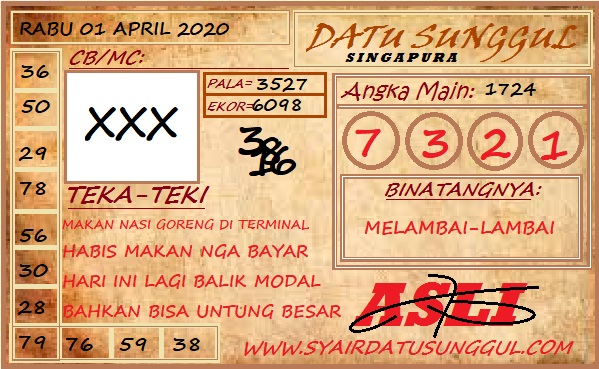 Tetap pergunakan naluri diri sendiri untuk membaca serta mengerti makna asal Syair Sgp 1 April 2020. Para Pemain Judi Online sebaiknya jangan terlalu terburu – buru dalam membaca makna yang berasal dari prediksi syair sgp kami. Pahamilah secara pelan serta pilih salah satu diantara syair yang paling banyak dicari oleh para pecinta togel online. Meskipun syair togel yang kami berikan ini sangat banyak serta beraneka ragam, tetapi pada dasarnya ada beberapa syair yang sangat banyak dicari seperti syair kampleng, syair pandawa, syair mbah semar, serta syair naga mas.