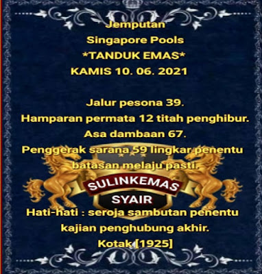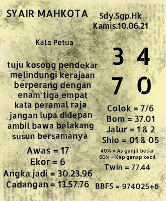 Tetap pergunakan naluri diri sendiri untuk membaca serta mengerti makna asal Syair Sgp 10 Juni 2021. Para Pemain Judi Online sebaiknya jangan terlalu terburu – buru dalam membaca makna yang berasal dari prediksi syair singapore kami. Pahamilah secara pelan serta pilih salah satu diantara syair yang paling banyak dicari oleh para pecinta togel online. Meskipun syair togel yang kami berikan ini sangat banyak serta beraneka ragam, tetapi pada dasarnya ada beberapa syair yang sangat banyak dicari seperti syair kampleng, syair pandawa, syair mbah semar, serta syair naga mas.