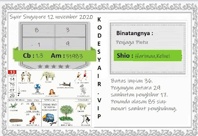 Tetap pergunakan naluri diri sendiri untuk membaca serta mengerti makna asal Syair Sgp 12 November 2020. Para Pemain Judi Online sebaiknya jangan terlalu terburu – buru dalam membaca makna yang berasal dari prediksi syair sgp kami. Pahamilah secara pelan serta pilih salah satu diantara syair yang paling banyak dicari oleh para pecinta togel online. Meskipun syair togel yang kami berikan ini sangat banyak serta beraneka ragam, tetapi pada dasarnya ada beberapa syair yang sangat banyak dicari seperti syair kampleng, syair pandawa, syair mbah semar, serta syair naga mas.