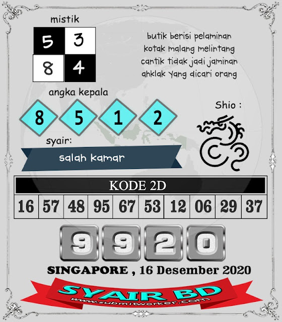 Pada dasarnya dalam semua permainan togel online ini sangatlah membutuhkan kepekaan atau kesadaran anda dalam membaca serta memprediksi nomor togel singapore. Oleh karena itu syair Togel Singapore yang kami terbitkan ini akan sangat memudahkan para pejudi online saat memprediksi angka keluaran di periode selanjutnya. kami sudah mempersiapkan dengan jelas tentang Prediksi Togel Sgp 16 Desember 2020 untuk anda para pencinta judi online.