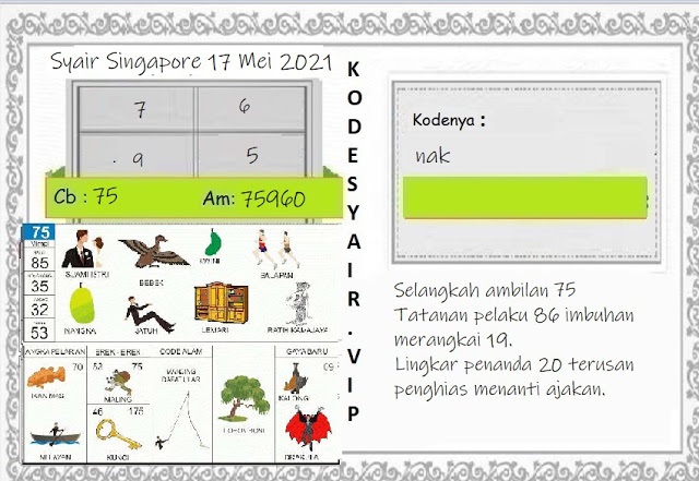 Tetap pergunakan naluri diri sendiri untuk membaca serta mengerti makna asal Syair Sgp 17 Mei 2021. Para Pemain Judi Online sebaiknya jangan terlalu terburu – buru dalam membaca makna yang berasal dari prediksi syair singapore kami. Pahamilah secara pelan serta pilih salah satu diantara syair yang paling banyak dicari oleh para pecinta togel online. Meskipun syair togel yang kami berikan ini sangat banyak serta beraneka ragam, tetapi pada dasarnya ada beberapa syair yang sangat banyak dicari seperti syair kampleng, syair pandawa, syair mbah semar, serta syair naga mas.