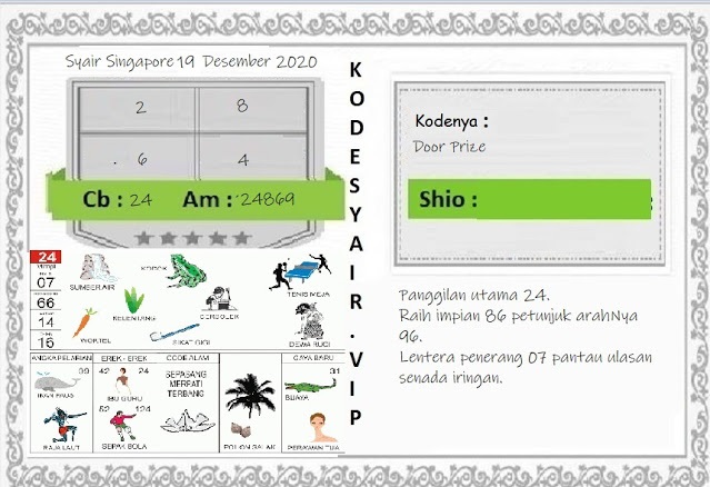 Pada dasarnya dalam semua permainan togel online ini sangatlah membutuhkan kepekaan atau kesadaran anda dalam membaca serta memprediksi nomor togel singapore. Oleh karena itu syair Togel Singapore yang kami terbitkan ini akan sangat memudahkan para pejudi online saat memprediksi angka keluaran di periode selanjutnya. kami sudah mempersiapkan dengan jelas tentang Prediksi Togel Sgp 19 Desember 2020 untuk anda para pencinta judi online.