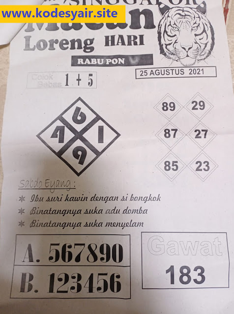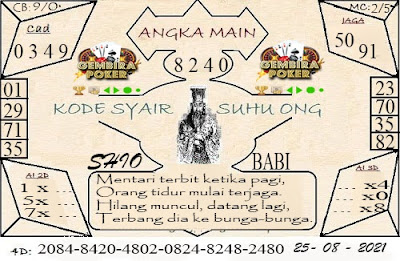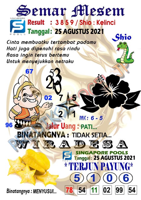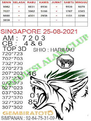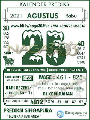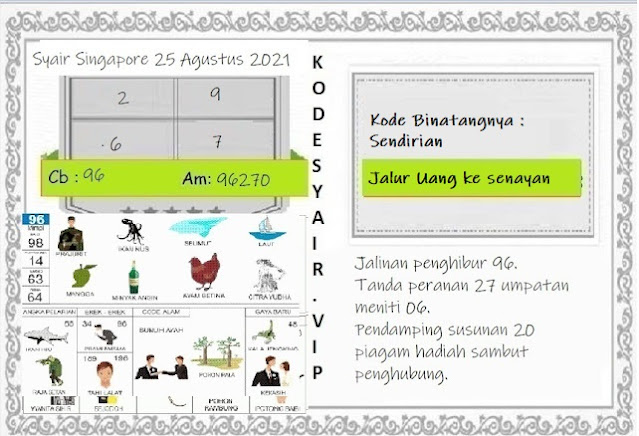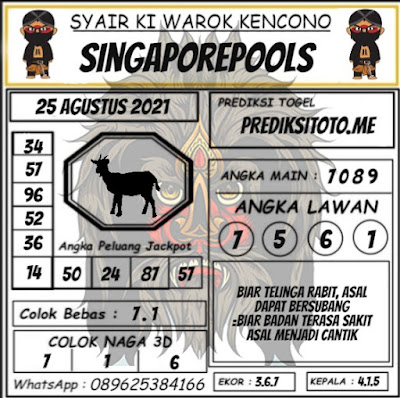 Pada dasarnya dalam semua permainan togel online ini sangatlah membutuhkan kepekaan atau kesadaran anda dalam membaca serta memprediksi nomor togel singapore. Oleh karena itu syair Togel Singapore yang kami terbitkan ini akan sangat memudahkan para pejudi online saat memprediksi angka keluaran di periode selanjutnya. kami sudah mempersiapkan dengan jelas tentang Prediksi togel Sgp 25 Agustus 2021 untuk anda para pencinta judi online.