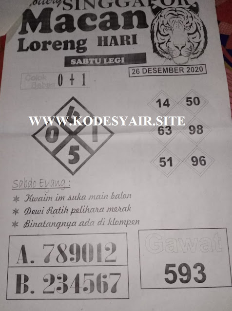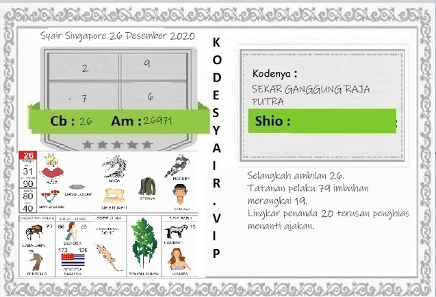 Pada dasarnya dalam semua permainan togel online ini sangatlah membutuhkan kepekaan atau kesadaran anda dalam membaca serta memprediksi nomor togel singapore. Oleh karena itu syair Togel Singapore yang kami terbitkan ini akan sangat memudahkan para pejudi online saat memprediksi angka keluaran di periode selanjutnya. kami sudah mempersiapkan dengan jelas tentang Prediksi Togel Singapore 26 Desember 2020 untuk anda para pencinta judi online.