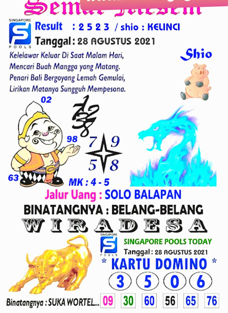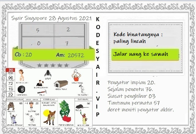 Tetap pergunakan naluri diri sendiri untuk membaca serta mengerti makna asal Syair Sgp 28 Agustus 2021. Para Pemain Judi Online sebaiknya jangan terlalu terburu – buru dalam membaca makna yang berasal dari prediksi syair singapore kami. Pahamilah secara pelan serta pilih salah satu diantara syair yang paling banyak dicari oleh para pecinta togel online. Meskipun syair togel yang kami berikan ini sangat banyak serta beraneka ragam, tetapi pada dasarnya ada beberapa syair yang sangat banyak dicari seperti syair kampleng, syair pandawa, syair mbah semar, serta syair naga mas.