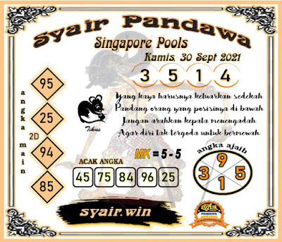 Tetap pergunakan naluri diri sendiri untuk membaca serta mengerti makna asal Syair Sgp 30 September 2021. Para Pemain Judi Online sebaiknya jangan terlalu terburu – buru dalam membaca makna yang berasal dari prediksi syair singapore kami. Pahamilah secara pelan serta pilih salah satu diantara syair yang paling banyak dicari oleh para pecinta togel online. Meskipun syair togel yang kami berikan ini sangat banyak serta beraneka ragam, tetapi pada dasarnya ada beberapa syair yang sangat banyak dicari seperti syair kampleng, syair pandawa, syair mbah semar, serta syair naga mas.