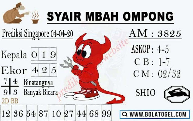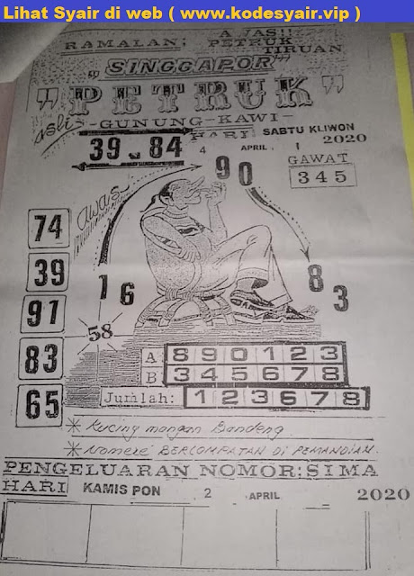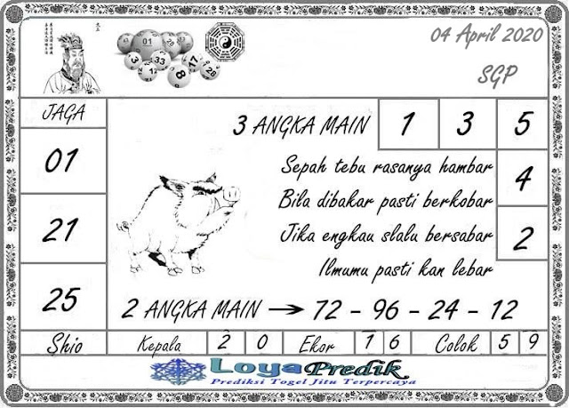 Pada dasarnya dalam semua permainan togel online ini sangatlah membutuhkan kepekaan atau kesadaran anda dalam membaca serta memprediksi nomor togel singapore. Oleh karena itu syair Togel Singapore yang kami terbitkan ini akan sangat memudahkan para pejudi online saat memprediksi angka keluaran di periode selanjutnya. kami sudah mempersiapkan dengan jelas tentang Prediksi togel Sgp 4 April 2020 untuk anda para pencinta judi online.