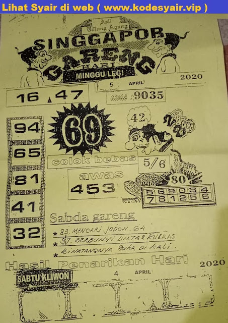 Tetap pergunakan naluri diri sendiri untuk membaca serta mengerti makna asal Syair Sgp 5 April 2020. Para Pemain Judi Online sebaiknya jangan terlalu terburu – buru dalam membaca makna yang berasal dari prediksi syair sgp kami. Pahamilah secara pelan serta pilih salah satu diantara syair yang paling banyak dicari oleh para pecinta togel online. Meskipun syair togel yang kami berikan ini sangat banyak serta beraneka ragam, tetapi pada dasarnya ada beberapa syair yang sangat banyak dicari seperti syair kampleng, syair pandawa, syair mbah semar, serta syair naga mas.