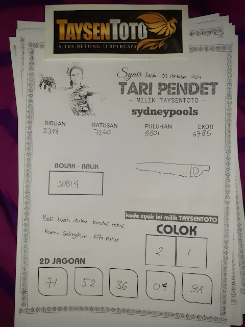 Daftar togel online terpercaya di JON4D untuk mendapatkan sebuah kode syair togel terjitu setiap harinya. Pastikan saja Anda tidak akan pernah melewatkan semua syair yang kami berikan ini. Syair Togel Sydney ini adalah yang paling banyak dicari oleh para pemain togel. Untuk itu tidak salah lagi jika anda sebagai Pemain togel online harus mengikuti secara terus menerus semua syair yang kami terbitkan di prediksi ini.