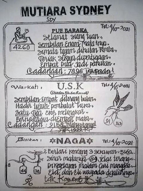 Jenis Permainan Togel Online ini sangat membutuhkan kesadaran dan kepekaan dalam membaca dan juga mamprediksi suatu angka togel. Terutama Syair 04 Oktober 2021, dalam forum syair sydney hari ini, kalian akan menemukan kode syair sydney hari ini, nah dalam prediksi togel sydney hari ini, kalian akan mendapatkan syair togel sydney terlengkap hanya di JON4D Sebagai Situs Judi Togel Online terbesar di Indoneisa. Dimana kami munculkan Syair Sydney terjitu agar memudahkan pemain dalam memahami angka keluaran di periode selanjutnya.