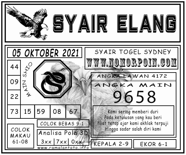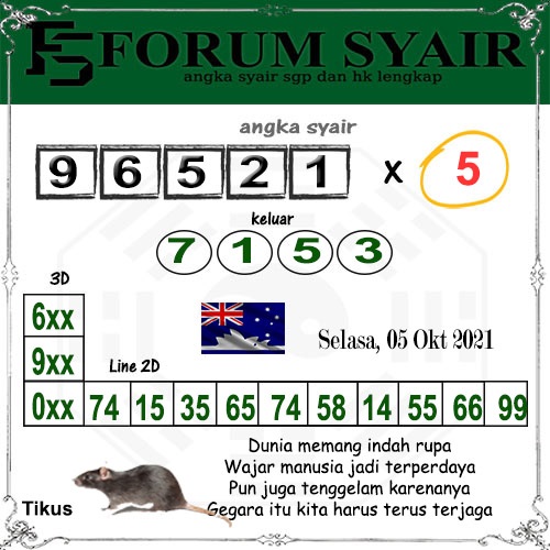 Jenis Permainan Togel Online ini sangat membutuhkan kesadaran dan kepekaan dalam membaca dan juga mamprediksi suatu angka togel. Terutama Syair 05 Oktober 2021, dalam forum syair sydney hari ini, kalian akan menemukan kode syair sydney hari ini, nah dalam prediksi togel sydney hari ini, kalian akan mendapatkan syair togel sydney terlengkap hanya di JON4D Sebagai Situs Judi Togel Online terbesar di Indoneisa. Dimana kami munculkan Syair Sydney terjitu agar memudahkan pemain dalam memahami angka keluaran di periode selanjutnya.