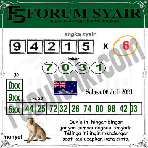 Jenis Permainan Togel Online ini sangat membutuhkan kesadaran dan kepekaan dalam membaca dan juga mamprediksi suatu angka togel. Terutama Syair 06 Juli 2021, dalam forum syair sydney hari ini, kalian akan menemukan kode syair sydney hari ini, nah dalam prediksi togel sydney hari ini, kalian akan mendapatkan syair togel sydney terlengkap hanya di JON4D Sebagai Situs Judi Togel Online terbesar di Indoneisa. Dimana kami munculkan Syair Sydney terjitu agar memudahkan pemain dalam memahami angka keluaran di periode selanjutnya.