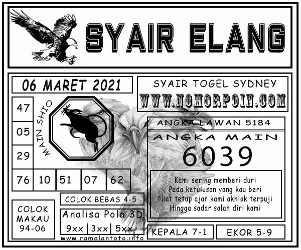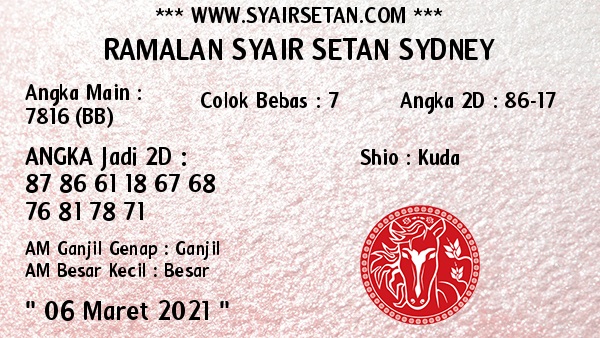 Jenis Permainan Togel Online ini sangat membutuhkan kesadaran dan kepekaan dalam membaca dan juga mamprediksi suatu angka togel. Terutama Syair 06 Maret 2021, dalam forum syair sydney hari ini, kalian akan menemukan kode syair sydney hari ini, nah dalam prediksi togel sydney hari ini, kalian akan mendapatkan syair togel sydney terlengkap hanya di JON4D Sebagai Situs Judi Togel Online terbesar di Indoneisa. Dimana kami munculkan Syair Sydney terjitu agar memudahkan pemain dalam memahami angka keluaran di periode selanjutnya.