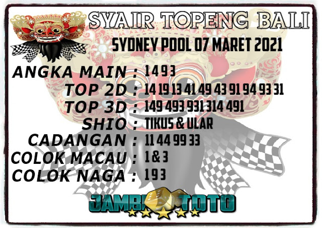 Jenis Permainan Togel Online ini sangat membutuhkan kesadaran dan kepekaan dalam membaca dan juga mamprediksi suatu angka togel. Terutama Syair 07 Maret 2021, dalam forum syair sydney hari ini, kalian akan menemukan kode syair sydney hari ini, nah dalam prediksi togel sydney hari ini, kalian akan mendapatkan syair togel sydney terlengkap hanya di JON4D Sebagai Situs Judi Togel Online terbesar di Indoneisa. Dimana kami munculkan Syair Sydney terjitu agar memudahkan pemain dalam memahami angka keluaran di periode selanjutnya.