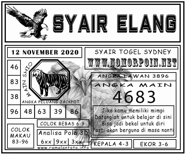 Jenis Permainan Togel Online ini sangat membutuhkan kesadaran dan kepekaan dalam membaca dan juga mamprediksi suatu angka togel. Terutama Syair 12 November 2020, dalam forum syair sydney hari ini, kalian akan menemukan kode syair sydney hari ini, nah dalam prediksi togel sydney hari ini, kalian akan mendapatkan syair togel sydney terlengkap hanya di JON4D Sebagai Situs Judi Togel Online terbesar di Indoneisa. Dimana kami munculkan Syair Sydney terjitu agar memudahkan pemain dalam memahami angka keluaran di periode selanjutnya.