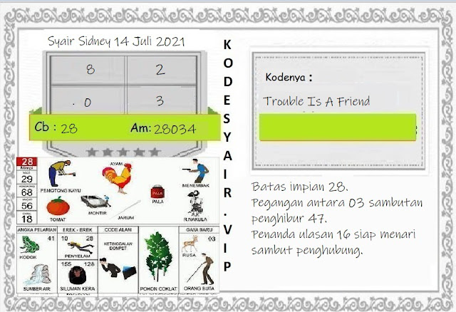 Oh ya, Selalu pergunakan naluri anda untuk membaca makna dari Prediksi Syair Sydney 14 Juli 2021. Janganlah membaca Prediksi Syair Sydney Terjitu dengan terlalu menggebu – gebu dari makna syair yang telah kami berikan. Pahamilah dengan pelan hingga mengerti maksud dari syair yang paling banyak dicari oleh pemain judi togel online ini. Setelah kalian memahami prediksi Syair Sydney ini Kemenangan dengan lebih mudah bisa kalian raih.