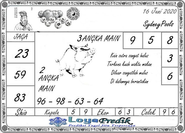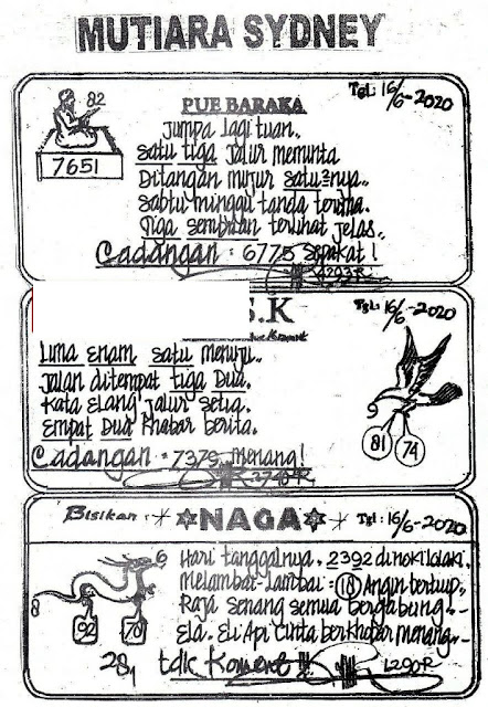 Oh ya, Selalu pergunakan naluri anda untuk membaca makna dari Prediksi Syair Sydney 16 Juni 2020. Janganlah membaca Prediksi Syair Sydney Terjitu dengan terlalu menggebu – gebu dari makna syair yang telah kami berikan. Pahamilah dengan pelan hingga mengerti maksud dari syair yang paling banyak dicari oleh pemain judi togel online ini. Setelah kalian memahami prediksi Syair Sydney ini Kemenangan dengan lebih mudah bisa kalian raih.