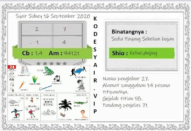 Jenis Permainan Togel Online ini sangat membutuhkan kesadaran dan kepekaan dalam membaca dan juga mamprediksi suatu angka togel. Terutama Syair 16 September 2020, dalam forum syair sydney hari ini, kalian akan menemukan kode syair sydney hari ini, nah dalam prediksi togel sydney hari ini, kalian akan mendapatkan syair togel sydney terlengkap hanya di JON4D Sebagai Situs Judi Togel Online terbesar di Indoneisa. Dimana kami munculkan Syair Sydney terjitu agar memudahkan pemain dalam memahami angka keluaran di periode selanjutnya.