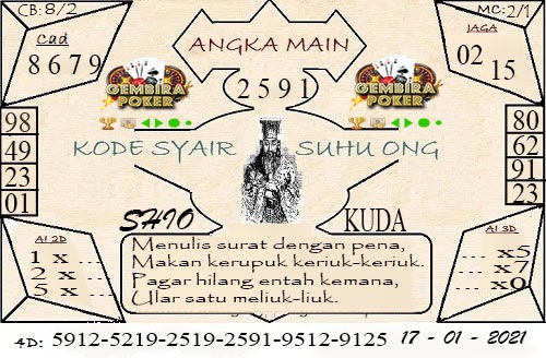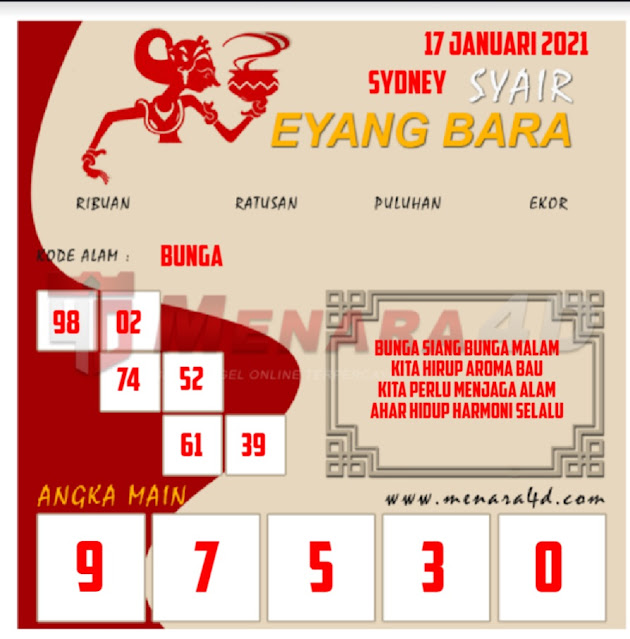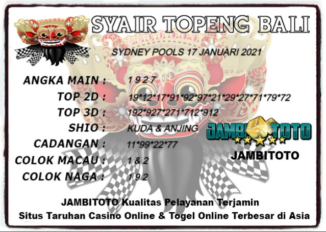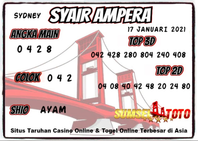 Jenis Permainan Togel Online ini sangat membutuhkan kesadaran dan kepekaan dalam membaca dan juga mamprediksi suatu angka togel. Terutama Syair 17 Januari 2021, dalam forum syair sydney hari ini, kalian akan menemukan kode syair sydney hari ini, nah dalam prediksi togel sydney hari ini, kalian akan mendapatkan syair togel sydney terlengkap hanya di JON4D Sebagai Situs Judi Togel Online terbesar di Indoneisa. Dimana kami munculkan Syair Sydney terjitu agar memudahkan pemain dalam memahami angka keluaran di periode selanjutnya.