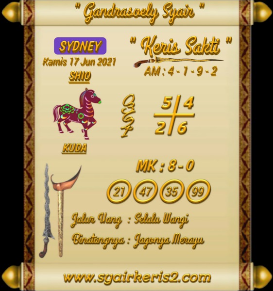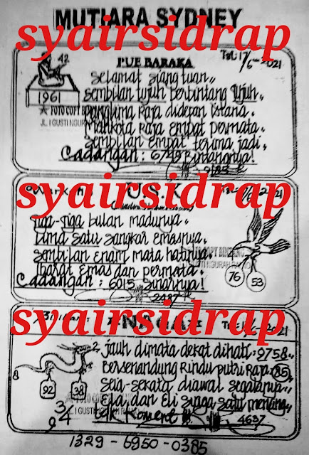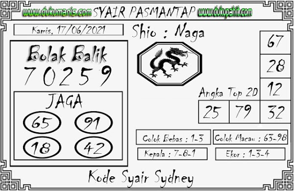 Oh ya, Selalu pergunakan naluri anda untuk membaca makna dari Prediksi Syair Sydney 17 Juni 2021. Janganlah membaca Prediksi Syair Sydney Terjitu dengan terlalu menggebu – gebu dari makna syair yang telah kami berikan. Pahamilah dengan pelan hingga mengerti maksud dari syair yang paling banyak dicari oleh pemain judi togel online ini. Setelah kalian memahami prediksi Syair Sydney ini Kemenangan dengan lebih mudah bisa kalian raih.