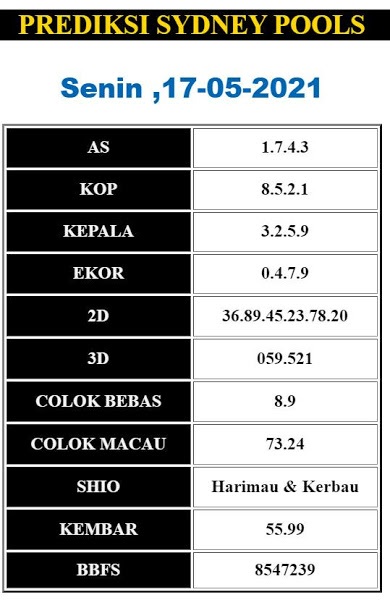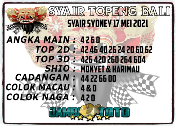 Jenis Permainan Togel Online ini sangat membutuhkan kesadaran dan kepekaan dalam membaca dan juga mamprediksi suatu angka togel. Terutama Syair 17 Mei 2021, dalam forum syair sydney hari ini, kalian akan menemukan kode syair sydney hari ini, nah dalam prediksi togel sydney hari ini, kalian akan mendapatkan syair togel sydney terlengkap hanya di JON4D Sebagai Situs Judi Togel Online terbesar di Indoneisa. Dimana kami munculkan Syair Sydney terjitu agar memudahkan pemain dalam memahami angka keluaran di periode selanjutnya.