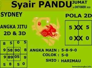 Jenis Permainan Togel Online ini sangat membutuhkan kesadaran dan kepekaan dalam membaca dan juga mamprediksi suatu angka togel. Terutama Syair 2 October 2020, dalam forum syair sydney hari ini, kalian akan menemukan kode syair sydney hari ini, nah dalam prediksi togel sydney hari ini, kalian akan mendapatkan syair togel sydney terlengkap hanya di JON4D Sebagai Situs Judi Togel Online terbesar di Indoneisa. Dimana kami munculkan Syair Sydney terjitu agar memudahkan pemain dalam memahami angka keluaran di periode selanjutnya.