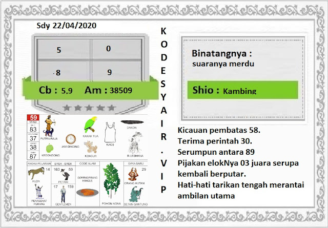 Oh ya, Selalu pergunakan naluri anda untuk membaca makna dari Prediksi Syair Sydney 22 April 2020. Janganlah membaca Prediksi Syair Sydney Terjitu dengan terlalu menggebu – gebu dari makna syair yang telah kami berikan. Pahamilah dengan pelan hingga mengerti maksud dari syair yang paling banyak dicari oleh pemain judi togel online ini. Setelah kalian memahami prediksi Syair Sydney ini Kemenangan dengan lebih mudah bisa kalian raih.