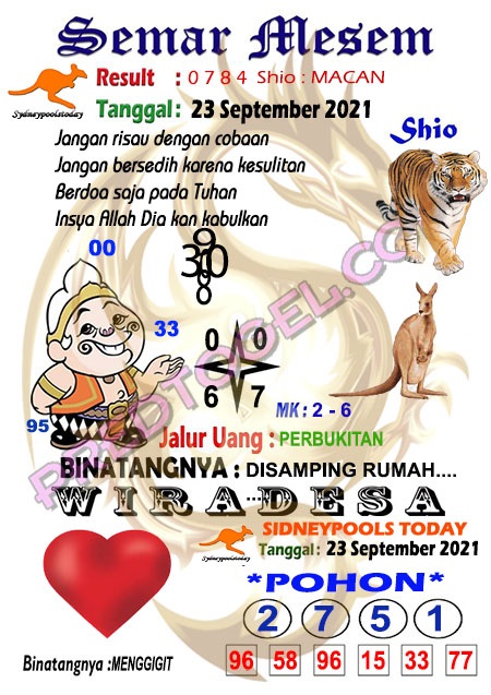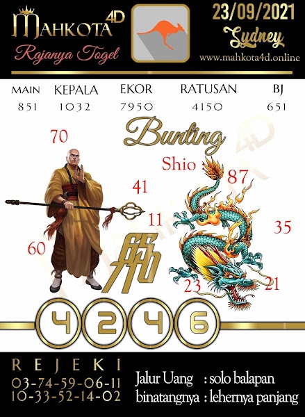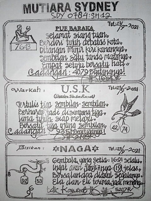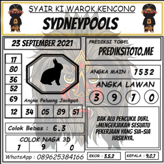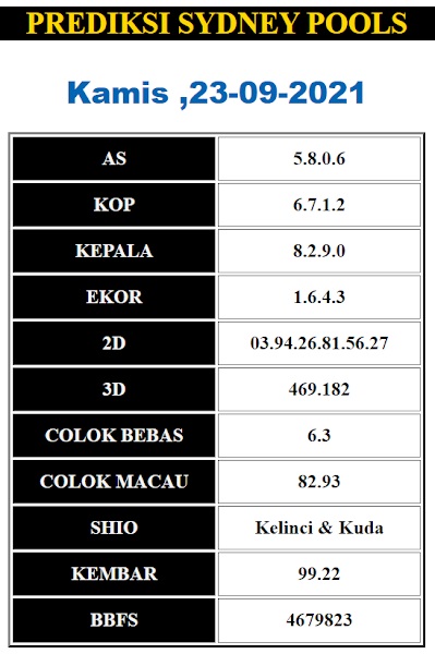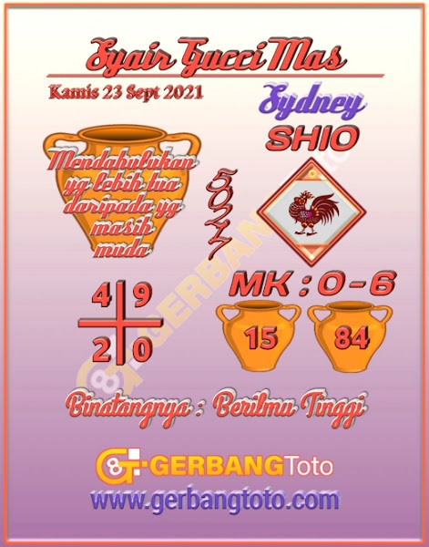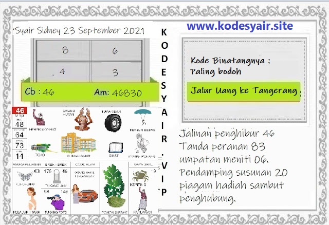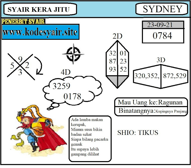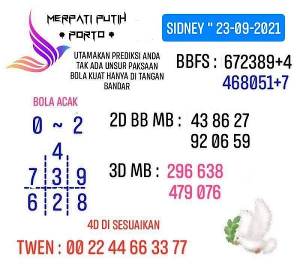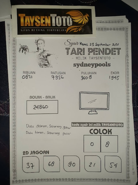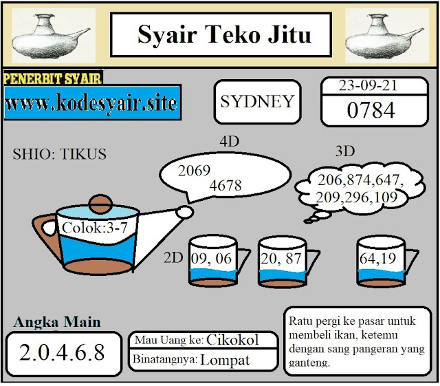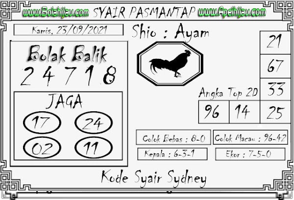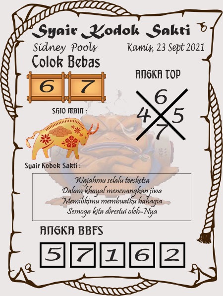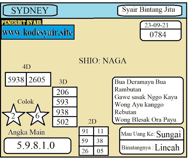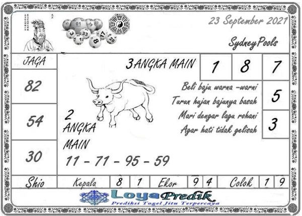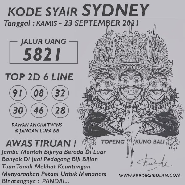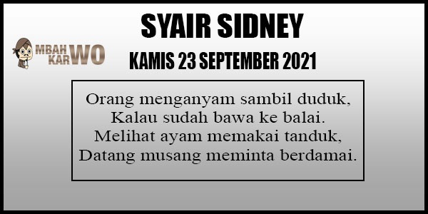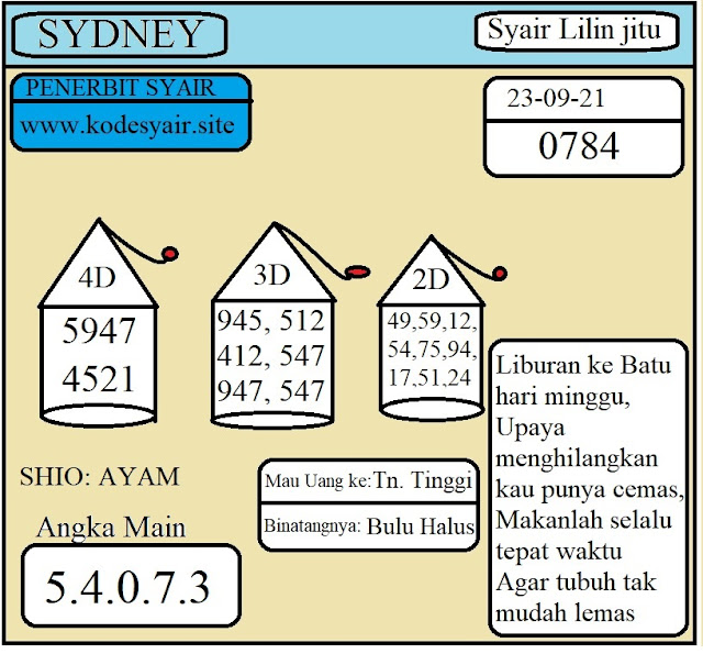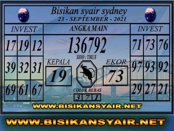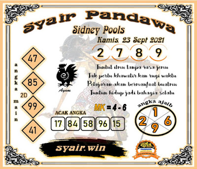 Oh ya, Selalu pergunakan naluri anda untuk membaca makna dari Prediksi Syair Sydney 23 September 2021. Janganlah membaca Prediksi Syair Sydney Terjitu dengan terlalu menggebu – gebu dari makna syair yang telah kami berikan. Pahamilah dengan pelan hingga mengerti maksud dari syair yang paling banyak dicari oleh pemain judi togel online ini. Setelah kalian memahami prediksi Syair Sydney ini Kemenangan dengan lebih mudah bisa kalian raih.