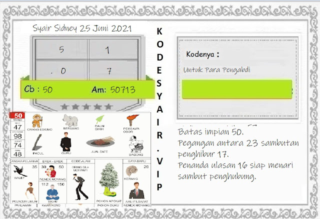 Oh ya, Selalu pergunakan naluri anda untuk membaca makna dari Prediksi Syair Sydney 25 Juni 2021. Janganlah membaca Prediksi Syair Sydney Terjitu dengan terlalu menggebu – gebu dari makna syair yang telah kami berikan. Pahamilah dengan pelan hingga mengerti maksud dari syair yang paling banyak dicari oleh pemain judi togel online ini. Setelah kalian memahami prediksi Syair Sydney ini Kemenangan dengan lebih mudah bisa kalian raih.