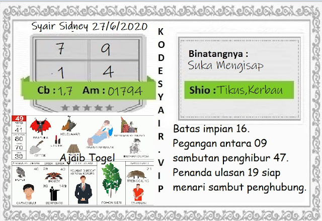 Oh ya, Selalu pergunakan naluri anda untuk membaca makna dari Prediksi Syair Sydney 27 Juni 2020. Janganlah membaca Prediksi Syair Sydney Terjitu dengan terlalu menggebu – gebu dari makna syair yang telah kami berikan. Pahamilah dengan pelan hingga mengerti maksud dari syair yang paling banyak dicari oleh pemain judi togel online ini. Setelah kalian memahami prediksi Syair Sydney ini Kemenangan dengan lebih mudah bisa kalian raih.
